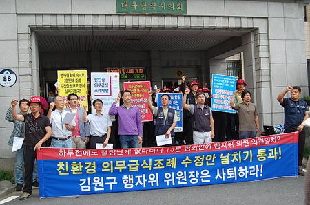 의무급식운동본부는 “구차한 변명으로 일관하는 김원구 행정자치위원장은 시민들에게 뒤통수를 친 날치기 식물조례 제정에 대한 책임을 반드시 져야 할 것”이라며 이날부터 대구시의회 임시회 폐회일인 20일까지 밀실야합 날치기 식물조례 원천무효와 의회 폭거를 자행한 김원구 행정자치위원장 사퇴를 촉구하는 단식농성에 돌입했다.