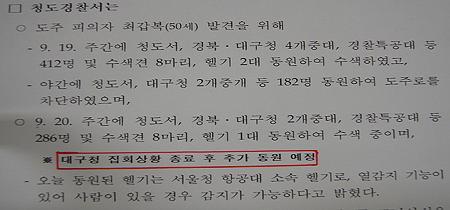 경북지방경찰청은 최씨의 검거를 위해 지난 19일 주간에 청도경찰서, 경북,대구경찰청 4개 중대, 경찰특공대 등 412명 및 수색견 8마리, 헬기 2대를 동원해 수색했고 야간에도 청도서, 대구청 2개중대 182명을 동원해 도주로를 차단했다. 경찰은 20일에도 주간에 청도경찰서, 경북,대구경찰청 2개 중대, 경찰특공대 등 286명 및 수색견, 헬기 등을 동원해 수색을 벌이고 있다. 문제는 19일 동원된 경찰병력의 수가 20일 주간에는 절반가량으로 대폭 축소됐다. 경북과 대구경찰청이 19일에는 4개 중대를 동원했지만 20일 오전에는 2개 중대만 동원했다. 줄어든 2개 중대는 대구청의 병력인 것으로 확인됐다.