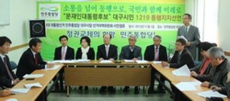 11월1일 오전 10시 민주통합당 대구시당 회의실에서 교수 변호사 예술인 등 대구시민 1천219명이 문재인 후보에 대한 공개 지지를 선언했다. 지역 대학교수 학계, 법조계, 문화예술계 인사 등으로 구성된 이들은 국가채무와 가계부채 급증에도 불구, MB정부의 부자감세, 4대강사업 등 불요불급한 대형 국책사업 강행으로 인한 불평등 심화와 절대적 빈곤 고착화 탈피를 지향하고 사람의 가치가 먼저인 세상, 공평과 정의의 대한민국을 열망한다며 문재인 후보를 공개 지지했다. 한편 민주통합당 대구선대위 시민캠프와 체인지대구, 대구시민단체연대회의, 대구경북진심포럼 통합진보당 대구시당, 진보정의당 대구시당, 대구녹색당, 대구YMCA, 대구청년유니온(준) 등은 ‘투표권보장대구공동행동’을 결성한다. 이들은 1일 오후3시 대구백화점 앞에서 발족 기자회견을 갖고 투표시간 연장 가두캠페인을 벌일 계획이며 오는8일에는 ‘달구벌대로를 점령하라-성서에서 시지까지’라는 슬로건을 걸고 오전7시30분부터 출근시간대 집중 1인 시위를 벌인다. 또 대구공동행동 청년모임은 기자회견에 앞서 오후2시 함께하는 청년회 주관으로 인증샷올리기 등 SNS활용에 대한 모임을 갖는 등 투표시간 연장에 적극 동참할 예정이다. 이에앞서 시민캠프는 지난달 29일부터 10월2일까지 5일간 매일 낮12시부터 1시간동안 대구 동성로 한일극장 앞에서 1인 시위를 통해 국민 참정권보장을 위한 투표시간 연장의 필요성과 타당성을 적극 홍보해 나가고 있다. <저작권자 ⓒ 브레이크뉴스 대구경북 무단전재 및 재배포 금지>