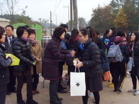 성주군 기관장 및 실과소장 부인들의 모임인 개나리회(회장 김복숙) 회원 10명은 8일(목) 새벽, 2013년 대학수학능력시험장인 성주고등학교 앞에서 수능시험 대박을 기원하는 봉사활동을 펼쳤다. 개나리회 회원들은 긴장된 마음으로 시험장을 향하는 수험생들에게 그 전날부터 정성들여 준비한 간식과 따뜻한 차를 하나하나 전달하며 응원의 메시지를 전했다. 개나리회 김복숙 회장은 ‟그동안 힘들게 준비한 만큼 좋은 결과가 나올테니 끝까지 최선을 다하기를 바란다.”며 수험생들의 선전을 기원했다. 회원들은 매년 수학능력시험장을 찾아 부모의 마음으로 수험생들을 격려하고 응원하는 봉사활동을 펼치고 있다. 한편 성주군은 수능시험일을 전후해 청소년들의 비행과 탈선을 예방하고 건전한 청소년 문화조성을 위한 캠페인 실시와 더불어 청소년 대상 음주, 담배 판매 여부 등을 특별단속 할 예정이다. 또 고3수험생을 위한 사회적응프로그램을 마련해 수학능력시험을 치른 후, 자칫 헛되게 보내기 쉬운 시간을 각종 행사 참여를 통해 알차게 보낼 수 있도록 계획하고 있다. <저작권자 ⓒ 브레이크뉴스 대구경북 무단전재 및 재배포 금지>