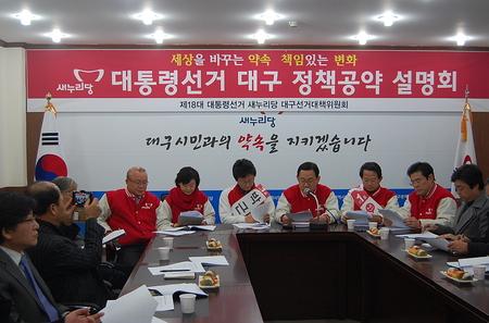 새누리당 대구선대위는 11일 오후 4시30분 대구시당사에서 제18대 대통령선거 대구지역 정책공약설명회를 개최하고 대구를 미래 대한민국의 첨단산업 중추도시로 성장시키기 위해 7대 공약을 발표했다.