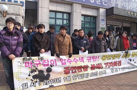 박근혜 정부 출범 1개월 남짓 남은 지난 16일 오전 8시, 대구지역 청년단체인 ‘대구경북민권연대’ 회원 2명의 가택에 대한 대구시경 보안수사대의 압수수색이 진행됐다. 압수수색 영장에 적시된 혐의는 ‘국가보안법 위반’이다. 지난 2007~2008년 ‘길동무’라는 청년단체 활동과 청학연대 가입 등이 국가보안법에 위반된다는 것이다. 대구시경은 지난해에도 전직 길동무 간부 4명에 대한 압수수색을 진행했지만 혐의를 입증하진 못했다. 대구경북진보연대는 17일 오전 11시 대구시경찰청 앞에서 ‘마구잡이 압수수색 규탄, 공안정국 조성 중단, 공안탄압 분쇄’를 위한 기자회견을 열고 “진보단체의 발을 묶어 정당한 활동을 위축시키려는 정치적 계산”이라고 비난했다. 대경진보연대는 또 “대선이 끝나자마자 무고한 청년들에 대한 무리한 압수수색을 진행한 것은 박근혜 당선인의 국민대통합과는 앞뒤가 맞지 않다”면서 “특히 출산을 앞둔 아내가 있음에도 마구잡이로 행한 압수수색은 어떠한 명분으로도 정당화 될 수 없다”고 주장했다. 대구경북진보연대는 “지금 국민이 바라는 것은 자신을 반대했던 국민에게 공안탄압의 칼날을 휘두르며 개인적 복수를 하는 지도자가 아니다”면서 “공안당국은 지금의 공안탄압 시도를 즉각 중단하라”고 촉구했다. 이에 대해 대구시경 관계자는 “혐의를 적시해 법원에 영장을 청구했고 법원이 압수수색 필요성을 인정했기 때문에 영장이 발부된 것”이라며 “법치국가에서 절차를 거쳐 시행하는 압수수색에 대해 공안탄압 운운하는 것은 전형적인 정치공세”라고 반박했다. <저작권자 ⓒ 브레이크뉴스 대구경북 무단전재 및 재배포 금지>