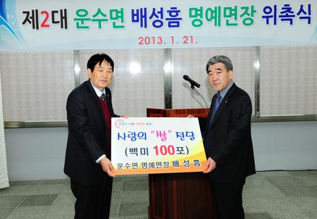 배성흠 명예면장은 운수면 봉평리 출신 출향인으로 현재 주식회사 그린에너지 대표이사이다. 매년 50만원~100만원을 이웃돕기성금으로 기탁하고, 면 건강증진센터 조성 시 운동 기구를(1천만원 상당) 기증했다. 운수면장(류시형)은 “나눔의 쌀을 기탁해 감사하고 지역의 장애인, 독거노인 등 취약계층 주민이 따뜻한 겨울을 날 수 있게 최선을 다하겠다"고 전했다. <저작권자 ⓒ 브레이크뉴스 대구경북 무단전재 및 재배포 금지>