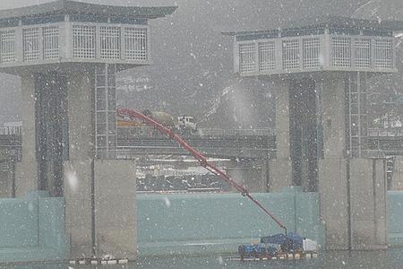 눈 내리는 겨울 보 보수공사 강행 ‘한심’환경단체 “한파 시 콘크리트 양생 문제···또 다른 부실 초래”