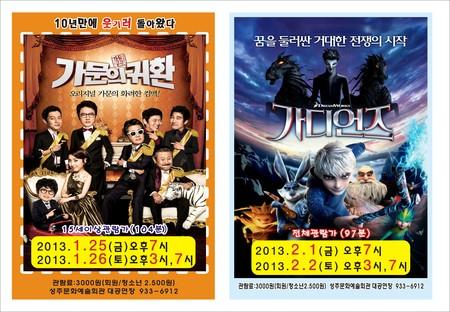 ‘가문의 영광’ 다섯 번째 시리즈인 ‘가문의 귀환’은 10년 전 애지중지하며 맞이한 사위 대서(정준호)와 가문에서의 입지를 위협받는 삼형제(유동근, 성동일, 박상욱)가 후계자 자리를 놓고 쟁탈전을 벌이는 내용이다. 2002년 ‘가문의 영광’ 1편의 정준호, 박근형, 유동근, 박상욱 등 원년 멤버가 가문 시리즈 10주년을 기념해 다시 뭉친 영화로 오는 25일(금) 오후 7시, 26일(토) 오후3시 7시 총 3회 문화예술회관 대공연장에서 상영하며 15세 이상 관람 가능하다. 개봉하자마자 '드래곤 길들이기'를 잇는 드림웍스의 웰메이드 애니메이션으로 거센 입소문을 불러 일으킨 ‘가디언즈’는 세상을 어둠으로 점령하려는 악몽의 신 ‘피치’에 맞서 ‘가디언즈’라 불리는 신의 정령들이 힘을 합쳐 어린이들에게 꿈과 동심을 지켜준다는 이야기로 쟁쟁한 신작들의 강세 속에서도 극장을 찾은 가족 관객과 20~30대 젊은 관객을 사로잡은 영화다. 다음달 2월1일(금) 오후 7시, 2일(토) 오후3시 7시 총 3회 문화예술회관 대공연장에서 상영하며 전체 관람 가능하다. 겨울방학을 맞은 아이들에게 추억을 선물하고 지역민에게 문화예술 향유의 기회를 제공하는 기회가 될 것으로 기대한다. <저작권자 ⓒ 브레이크뉴스 대구경북 무단전재 및 재배포 금지>