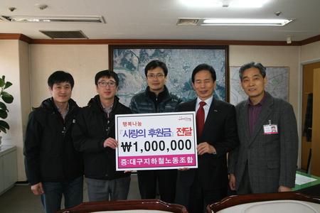 지하철 노동조합은 해고자 생계비 마련을 위해 진행된 재정사업을 대구지하철노조뿐 아니라 공공사업장과 전국 궤도사업장 조합원들의 성원과 관심으로 성공을 거뒀다. 이에 노동조합은 주위의 따뜻한 격려와 지지에 보답코져 수익금의 일부를 사랑나눔에 행사에 기탁했다. 이승용 위원장은 “지역의 책임있는 공기업 노도로서 지역사회의 역할과 책무에 최선의 노력을 다해 나가고 소외계층과 어려움을 함께하는 이웃사랑 실천에도 책임을 다하겠다.”고 밝혔다. <저작권자 ⓒ 브레이크뉴스 대구경북 무단전재 및 재배포 금지>