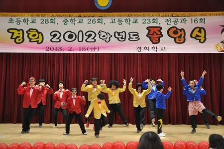 이날 졸업식은 경희학교만의 특색있는 졸업식을 주제로 졸업생 합창, 재학생 공연, 오카리나, 비보이 초청 공연, 세족식, 학부모 편지 낭독과 마지막 '소원 풍선'띄우기 순으로 진행됐다. 특히 반짝이 의상을 입은 재학생들의 '강남스타일'의 무대는 관중을 압도하는 흥겨운 무대였고, 학부모의 편지 낭독을 통해서 장애아의 부모로서의 고충을 이해하고 공감할 수 있는 시간도 됐다. 경희학교는 이 졸업식을 통해 초등부 5명, 중학부 10명, 고등부 10명, 전공과 18명의 졸업생 배출로 진학 및 취업의 새로운 첫발을 내딛게 됐다. <저작권자 ⓒ 브레이크뉴스 대구경북 무단전재 및 재배포 금지>