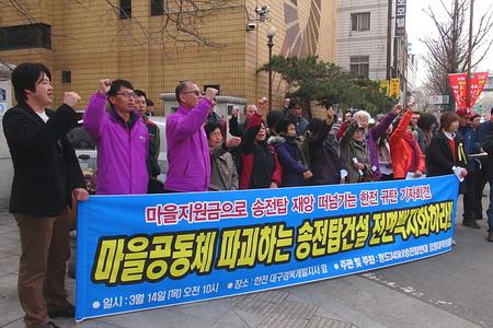 송전탑공대위는 “한전 측이 고용한 용역을 동원 무리한 송전탑 공사로 삼평리의 연로한 마을주민들에게 심각한 육체적·정신적 피해를 입힌데 이어 ‘마을발전기금’이란 ‘떡고물’로 마을주민들 간의 질시와 반목으로 마을공동체를 파괴하는 농간질을 하고 있다”고 비난했다. 2008년 시작된 청도 송전철탑 공사는 부산 ‘신고리’ 원자력발전소에서 경남 양산ㆍ밀양, 경북 청도에 걸쳐 총 161개가 세워지게 되며 청도 각북면 삼평1리 일대에는 22호기와 23호기, 24호기가 세워지고 있다. 삼평1리 주민 20여 명이 송전탑 건설에 반대하며 23호기 건설현장 진입로 입구 옆에서 천막 농성을 벌여오고 있다. 삼평1리에 근접해 지나가는 345kV의 송전철탑 3기 가운데 23호 송전철탑은 불과 100미터 안쪽에 민가가 있어 전자파 피해에 대한 우려가 크다. 현재 마을주민들은 마을공동체가 붕괴일로에 처한 현실을 한탄하고 있다. 한전의 송전탑 공사로 저 평화롭고 우애롭던 마을사람들이 지금 둘로 갈라져 등을 맞대고 서로 욕을 하고 싸우고 있기 때문이다. 한전은 송전선로가 지나가는 토지의 보상금과는 별도로 청도군의 해당 15개 마을에 마을발전기금으로 평균 2억원을 약속했고 풍각면과 각북면 2곳에는 별도의 지원금으로 15억원을 약속하고 10억원은 미리 지급했다.