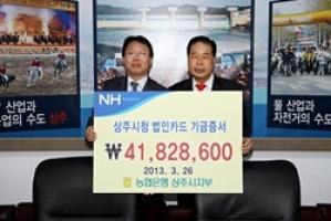 농협은행 상주시지부가 지난 26일 ‘NH농협카드 상주사랑 발전기금’ 41백828천6백원을 상주시에 기탁했다. 상주시는 투명한 예산관리를 위해 농협상주시지부와 제휴하고 각종 예산이나 민간단체 보조금을 제휴카드로 결제할 경우 농협이 이용금액의 일정비율을 기금으로 조성 상주시 발전기금으로 기탁하고 있다. 지난 2006년부터 현재까지 발전기금으로 총 2억9천3백여만원을 기탁해 왔으며, 평소에도 농협은행 상주시지부는 상주상무축구단에 대한 각종 후원과 어려운 이웃돕기, 농업․농촌 발전을 위한 다양한 지원활동을 추진해 왔다. 성백영 시장은 “상주발전을 위해 다양한 지원과 어려운 이웃을 위한 봉사활동 등을 지속적으로 추진해 오고 있는 농협은행 상주시지부 관계자들에게 감사드리며, 이번에 기탁한 발전기금은 상주발전을 위한 재원으로 사용할 계획이라“고 밝혔다.