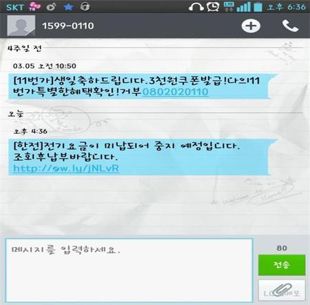 쇼핑몰을 흉내 내는 등 스마트폰을 활용한 각종 스미싱이 활개를 치고 있는 가운데 한전을 사칭해 개인정보를 빼내고 이 정보로 결재를 하는 피해가 발생하고 있어 주의가 요구된다.