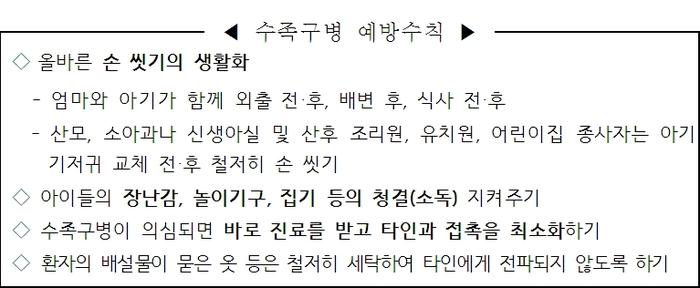 경산시는 5일 시 산하 보건관련 기관 등에 수족구병에 대한 예방 및 대응책을 전달하고 시민들이 예방수칙을 잘 지켜 줄 것을 당부했다. 경산시 보건 관계자는 “수족구병은 주로 물집의 진물이나 콧물 등 분비물을 직접 만져 전파되는 만큼 손을 자주 씻고, 장난감 등을 자주 소독하는 것이 좋다”면서 “가벼운 미열과 함께, 혀, 잇몸, 뺨의 안쪽 점막과 손, 발등에 빨갛게 선이 둘린 쌀알 크기의 수포성 발진이 생기거나 1주일이 지나도 없어지지 않을 경우, 뇌염과 무균성 뇌수막염 등 신경계 합병증이 의심되므로 신속하게 전문 치료를 받을 것”을 권고했다. 수족구병을 예방하기 위해서는 손을 잘 씻고, 놀이기구와 장난감, 집기 등을 잘 청소할 것과 의심되는 즉시 진료와 함께 타인과의 접촉을 피하는 한편, 배설물 등이 묻은 옷의 철저한 세탁과 타인에게 전파되지 않도록 주의해야 한다.