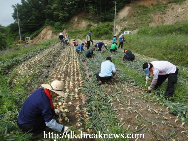 올해 양파 파종기에 갑작스런 기온 저하 및 서리피해로 인해 작황부진과 일손부족 등으로 채소농가들이 깊은 시름에 잠겨있는 계상리 임락용(60세)씨 농가를 찾아 800여평의 양파수확을 도왔다.