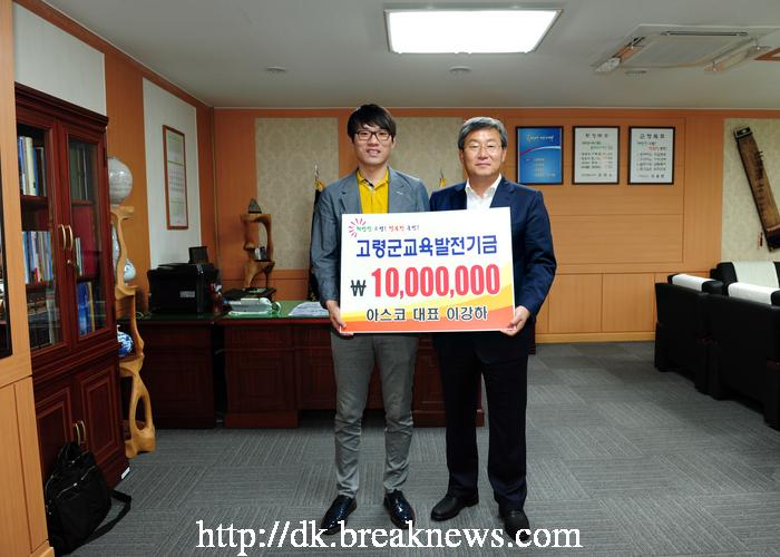 지난 12일 고령지역출신의 젊은 사업가인 아스코(대표 이강하, 대구소재)가 사)고령군교육발전위원회(이사장 곽용환 고령군수)을 방문해 1천만원의 교육발전기금 쾌척했다.