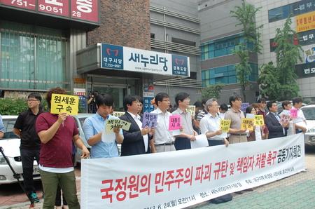 천주교정의평화위원회, 대구경북진보연대, 대구참여연대, 6.15선언실천대경본부, 민주당대구시당, 진보정의당대구시당, 통합진보당대구시당 등 15개 단체로 구성된 ‘대구지역 제 정당, 시민단체’는 24일 오전 10시 30분 새누리당 대구시당사 앞에서 기자회견을 열고 ‘국정원 민주주의 파괴 규탄 및 책임자 처벌’을 촉구했다. 체인지 대구 함종호 대표와 대구경북목회자정의평화위원회 고경수 목사, 대구경북진보연대 백창욱 상임대표, 대구시민단체연대회의 노진철 상임대표 등은 시국연설을 통해 원세훈 전 국정원장과 김용판 전 서울경찰청장의 구속수사와 박근혜 대통령의 사과를 강력 요구한다고 주장했다. 이들은 이날 발표한 기자회견문을 통해 “국정원게이트는 대한민국의 헌정질서를 망치는 민주주의 파괴행위로써 권력기구들에 의해 피땀으로 일구어온 민주주의가 위협받고 있다”면서 “불의한 권력에 의해 민주주의가 일순간에 무너질 수 있다는 사실은 참으로 비통하다”고 주장했다. 이어 “국정원은 국가 안보를 위한 집단이 아니라 여당의 집권연장을 위해 선거개입을 자행한 공작정치의 본산이며 경찰은 이를 은폐해 박근혜 정부 탄생의 일등공신이 되었다”면서 “검찰에게 사건을 몸통을 수사, 처벌할 것을 가대할 수 없으므로 반드시 국정조사를 통해 국정원, 경찰과 새누리당 선대위의 국기문란 커넥션 의혹을 명명백백 밝혀야 한다”고 주장했다.