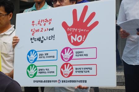 전국의 중학교 3학년, 고등학교 2학년 학생들이 똑같은 문제로 일제고사를 치르고 있는 25일 오전 10시 전국교직원노동조합 대구지부가 대구시교육청 현관 앞에서 기자회견을 열고 학교교육의 파행을 조장하고 창의성을 말살하는 일제고사를 폐지하라고 촉구했다.