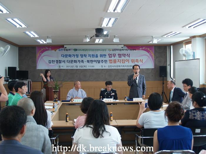 김천경찰서(서장 백동흠)가 9일 김천시다문화가족지원센터 2층에서 다문화가정 및 북한이탈 주민 법률지원을 위한 법률지킴이 자문변호사 위촉식과 도로교통관리공단 문경운전면허시험장과 다문화가정 운전면허 취득을 위한 업무협약식를 개최했다.