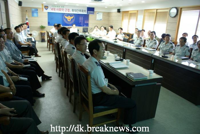 김천경찰서가 15일 경찰서 2층 열린방에서 각 과‧계장 및 파출소장 등 40여명의 직원들이 참석한 가운데, '치안성과 보고회 및 4대 사회악 근절을 위한 확대간부회의'를 개최했다.
