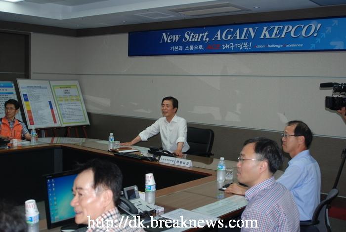 이날 김범일 시장은 한전 대구경북지역본부 4층에서 운영중인 비상수급 대책상황실을 방문, 전력수급 안정을 위해 애쓰고 있는 한전 직원들의 노고를 격려하고, 하계 전력수급현황 및 전망에 관한 설명을 들었다. 이 자리에서 김 시장은 “전력수급위기를 슬기롭게 극복하기 위해 대구시와 한전이 긴밀하게 협조해야 한다며, 이를 위한 지원을 아낌없이 하겠다“고 약속했다. 한편 김시호 한전 대구경북지역본부장은 “2013 대구세계에너지총회 유치활동 등 여러 가지 공무로 바쁘신 가운데 한전을 방문해, 전력수급상황에 관심을 가져 주셔서 감사하다며, 전력수급 안정을 위한 모든 역량을 다할 것이라“고 밝혔다. 또한 오는 10월13일부터 대구 엑스코에서 개최되는 2013 대구세계에너지총회 시 무결점 전력확보는 물론, 대구시와 긴밀한 협조관계를 구축해 성공적인 개최에 전 방위 지원을 할 것도 약속했다. <저작권자 ⓒ 브레이크뉴스 대구경북 무단전재 및 재배포 금지>