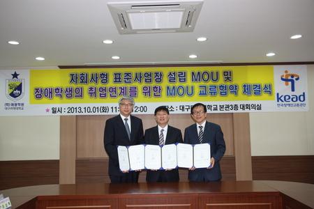 지난 1일 학교법인 애광학원(이사장 이근민), 한국장애인고용공단 대구지사(지사장 한태림), 대구미래대학교(총장 서희돈)가 대구미래대학교 3층 대회의실에서 관계자 15명이 참석한 가운데 ‘자회사형 표준사업장 설립 협약식’과 ‘장애학생들의 취업연계를 위한 교류 협약식’을 가졌다. 이날 협약식체결로 대구미래대학교는 전문대학의 학교법인으로서는 최초로 자회사 표준사업장 설립을 추진할 수 있게 됐다.