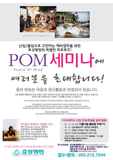 대구 경동의료재단 효성병원(병원장 박경동)이 오는 12월 9일 저녁 7시 만촌동 인터불고 호텔에서 난임‧불임으로 고민하는 예비엄마들을 대상으로 한 POM(peace Of Mind) 세미나를 개최한다.