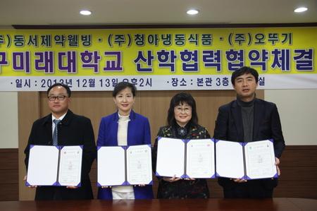 지난 13일 대구미래대학교(총장 이예숙) 특수체육재활과, 특수예술재활과, 특수직업재활과(학과장 서명교)는 (주)동서제약웰빙(대표이사 최경자), (주)오뚜기(공장장 채종수) (주)청아냉동식품(전무이사 정광호)과 산학협력 MOU를 체결했다.