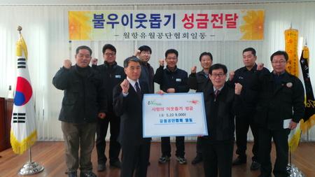 지난 28일 성구군 유월공단협회(협회장 한세욱,(주)SH)가 설 명절을 맞아 ‘희망 2014 나눔캠페인’에 성금 5백22만9천원을 쾌척해 사랑의 온도를 높였다. 성주군 월항면 유월리에 위치한 유월공단협회는 (주)SH(대표 한세욱)을 비롯한 약 20여개의 공장이 있으며, 매년 불우이웃을 돕기 위한 쌀 후원 등을 실천하고 있다.