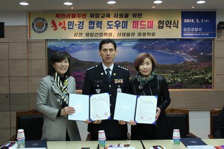 김천경찰서(서장 정은식)가 지난 5일 김천경찰서 2층 열린방에서 김천지역 북한이탈주민 취업능력 향상과 안정적 취업지원을 위해 ‘홍익 민‧경 협력 도우미 미드미 협약식’을 체결했다.