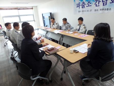 김천경찰서(서장 정은식)가 가정폭력으로부터 여성들을 보호하기 위해 지난 27일 여성긴급전화 1366경북센터와 합동으로 북부파출소 2층 회의실에서 ‘권역별 파출소장 순회 간담회’를 개최했다. 이날 간담회는 1366경북센터장 진원스님, 양창환 김천경찰서 여성청소년과장을 비롯한 북부지역 7개 파출소장 등이 참석한 가운데 가정폭력, 성폭력, 성매매, 결혼이주여성 등 폭력 피해 여성 초동조치 및 수사개입에 대한 방향에 대해 논의했다.