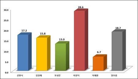 포항시장 여론조사 결과 -이강덕 ‘선두’ 김정재 모성은 ‘약진’ 공원식 ‘정체’이강덕28.6% 공원식17.2% 김정재15.8% 모성은13% 이재원6.7%
