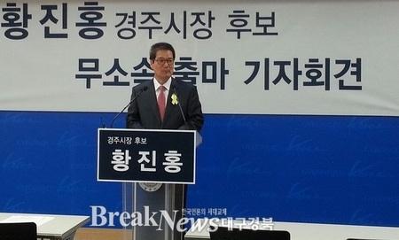 황진홍 경주시장 후보가 무소속 출마를 선언했다. 그는 시청 브리핑실에서 기자회견을 갖고 “각종 탈법과 불법적인 사건으로 얼룩진 새누리당 경선에 불복해 탈당과 함께 무소속으로 출마를 결심했다”며 “새누리당 의 불공정한 경선이 출마를 결심하게 된 배경”이라고 설명했다. 그는 이어 “ 이번 경선과정에 있어서 불공정한 부분을 새누리당에 수차례 지적하고 개선을 요구했지만 돌아온 것은 무시밖에 없었다”며 “ 새누리당의 경선 결과에 승복할 수 없고, 또 진정한 경주시민의 뜻을 확인하려 한다”고 덧붙였다.