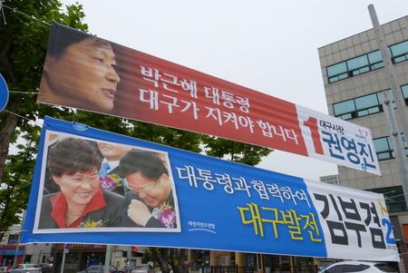 권영진 후보는 선거 나흘을 앞두고 박근혜 대통령의 눈물 사진을 담은 거리현수막을 일제히 걸었다. ‘박근혜 대통령 대구가 지켜야 합니다’라는 문구를 넣은 현수막이 김 후보 현수막과 나란히 걸리면서 시민들은 어리둥절하는 모습이다. 도대체 누가 새누리당 후보이고 누가 새정치민주연합 후보인지 모르겠다는 푸념도 있다.