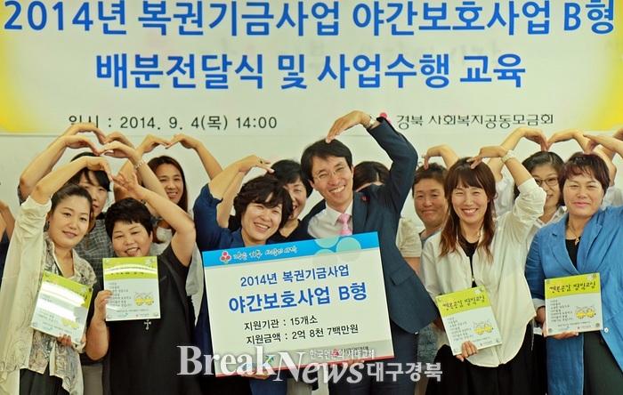 경북사회복지공동모금회(회장 이대공)는 4일, 경북사회복지공동모금회 대회의실에서 ‘2014년도 복권기금 야간보호사업 배분전달식’을 개최하고, 신규 사업 수행기관 15개소에 사업비 2억 8,700여만원을 추가 지원했다.
