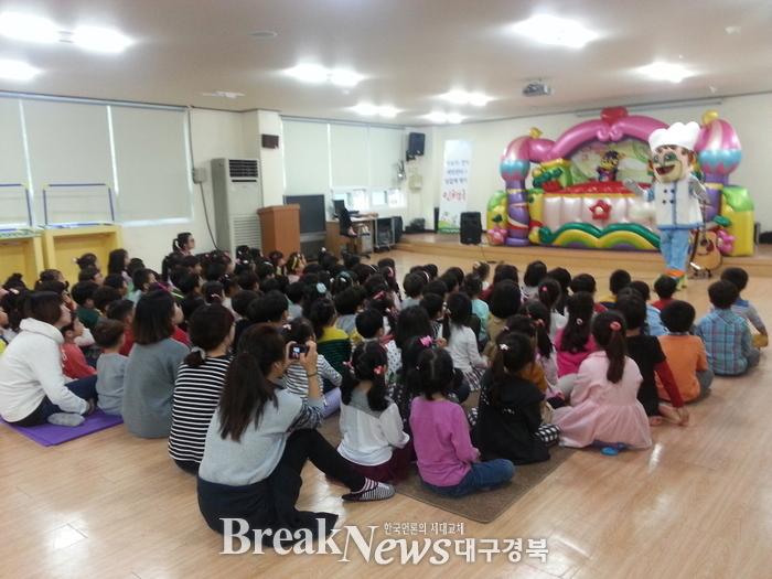 포항시 남구보건소는 지난 20일 아토피․천식 안심학교(유치원)인 상대초등학교와 새롬유치원 강당에서 국민건강증진운동본부 별마당 인형극회를 초청해 아토피․천식 예방관리 및 싱겁게 먹기를 주제로 ‘튼튼대장의 건강작전’인형극을 공연했다.