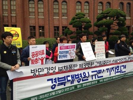 경북대병원이 제2병원인 칠곡경북대병원에 이어 임상실습동(제3병원) 건립을 추진하자 민주노총 공공운수노조 의료연대본부 대구지부(이하 의료연대)가 22일 부채에 허덕이고 있는데도 제3병원을 건립하는 것은 병원부실화를 초래하는 무분별한 몸집불리기라며 계획을 전면 백지화하라고 촉구하고 나섰다. 의료연대에 따르면 1,730억원을 투입해서 개원한 칠곡경북대병원을 개원했다. 이는 2007년부터 2010년까지 경북대병원이 거둬들인 수익 928억원의 2배에 가까운 금액이다. 경북대병원이 칠곡경북대병원 건립을 위해 차입한 금액은 810억원에 달하며, 매년 238억원의 감가상각비, 42억원의 이자비용 등 각종 비용이 대폭 증가했다. 그럼에도 칠곡경북대병원 2011년 개원 이후 3년간 평균 132억원의 의료손실, 131억원의 당기순손실을 기록하는 등 매년 대규모 손실을 기록하고 있다. 의료연대는 칠곡경북대병원을 개원하며 비정규직의 수는 3배, 비정규직 비율은 2배 이상 증가했다는 점도 지적했다. 칠곡경북대병원을 개원하는 과정에서 숙련도가 떨어져 의료서비스 질에 악영향을 미칠 수밖에 없는 비정규직 고용형태를 과도하게 도입했다는 것. 경북대병원(칠곡병원 포함)에서 일하는 비정규직 수는 2010년 243명에서 2013년 686명으로 3배 가까이 증가했다. 그 결과 전체 인력에서 비정규직이 차지하는 비율 역시 9.4%에서 21.4%로 2배 이상 증가했다. 병원 규모 확장 과정에서 비용 절감을 위해 비정규직 고용을 확대한 것으로 칠곡경북대병원 개원과 함께 병원의 상업화 경향이 더욱 심각해지고 있다.는 것이 의료연대 주장이다. 의료연대는 또한 숙련된 인력이 아닌 비정규직 비율이 늘어날수록 의료서비스 질은 떨어질 수밖에 없고 810억원에 달하는 차입금을 회수하기 위해서 돈벌이 중심의 환자 치료 형태가 심해지고, 비정규직 확대와 노동력 쥐어짜기가 더 심각해지는 것은 필연적 결과라고 주장했다. 의료연대는 실례로 경북대병원이 칠곡 어린이병원 개원 후 분만실과 신생아실을 이전하였고 이를 이유로 본원의 분만실, 신생아실 운영을 사실상 포기함으로써 3차종합병원으로서의 기능을 포기하는 지경에 이르렀으며 지난해에는 더 많은 수익을 얻기 위해 중소병원에서 재활치료가 가능한 환자까지도 칠곡경북대병원에 입원하도록 유도하는 일까지 벌어지고 있다는 환자의 증언을 소개하기도 했다. 의료연대는 이러한 상황에서 또 다시 임상실습동(제3병원)을 건립하는 것은 밑 빠진 독에 물 붓기로 경북대병원을 위험에 빠뜨린다고 주장했다. 의료연대 주장에 따르면 임상실습동은 칠곡경북대병원보다 더 큰 규모의 공사로, 현재 계획된 투자 금액이 2,468억원으로 칠곡경북대병원의 사례에 비추어 추계할 경우 예상되는 차입금 규모는 약 1,200억원이다.