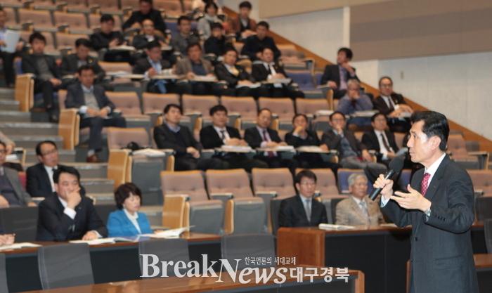 이강덕 포항시장이 지난 25일 포스코국제관 국제회의장에서 열린 포항지역 중소기업융합 포항·형산·경포 합동교류회에 참석해 ‘창조도시 포항’을 주제로 특강을 진행했다.