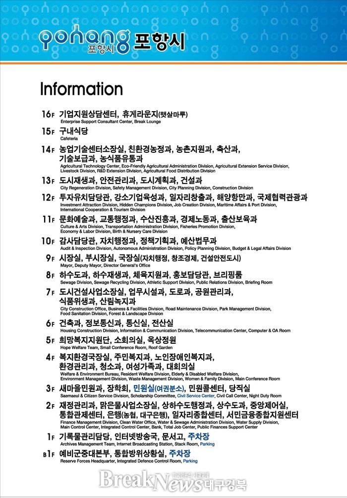 포항시는 지난 1일자 행정조직 개편에 따른 기구의 증설 및 부서조정으로 부서이동을 최소화하고 업무의 연속성 및 대시민 행정서비스를 극대화하기 위해 청사를 재배치했다.