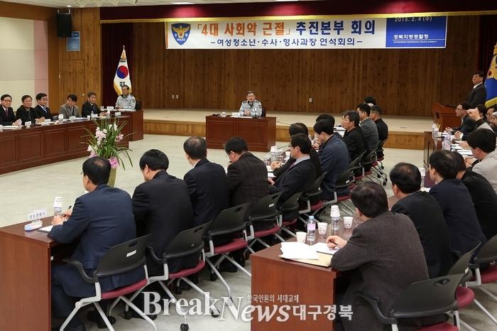 경북경찰청(청장 김치원) 에서는 지난 4일 오후2시, 5층 대회의실에서 지난해 4대 사회악 근절 추진성과를 점검하고 15년 추진방향을 논의하기 위해 도내 경찰서 주무과장 연석회의를 개최했다.