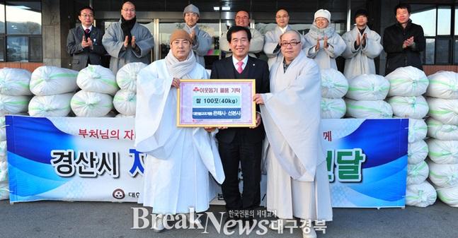 이에 최영조 경산시장은 “경제 불황속에서도 주변의 어려운 이웃을 먼저 생각하고 따뜻한 정을 이웃과 함께하는 ‘자비나눔’을 실천해 주신 은해사와 선본사에 감사의 인사를 드린다”고 인사한 뒤 “이런 따뜻한 마음이 소외된 이웃들에게 잘 전달되어 어느 때보다 훈훈한 설 명절을 보낼 수 있을 것”이라며 고마움을 표했다.