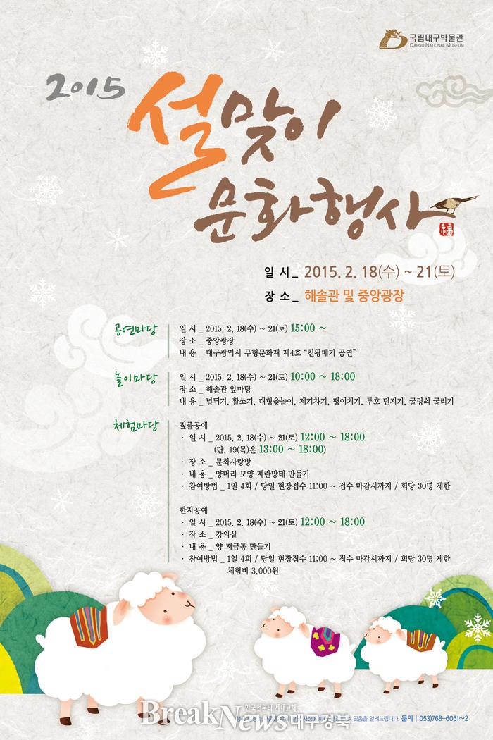 국립대구박물관(관장 함순섭)은 2015년 을미년 설날을 맞아 오는 18일부터 21일까지 4일간 공연마당, 민속놀이마당, 체험마당 등 다양한 문화행사를 준비했다.