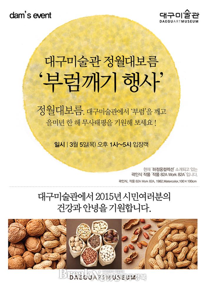 ’정월대보름 부럼나누기‘ 이벤트는 2015년 시민들의 건강과 안녕을 기원하며 오는 5일 오후 1시부터 5시까지 전시장에 입장하는 관람객들을 대상(300명 한정)으로 부럼을 나누어 준다.