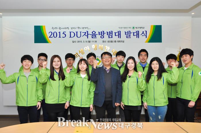 대구대는 지난 9일 경산캠퍼스 성산홀(본관) 대회의실에서 ‘DU(Daegu University) 자율방범대 발대식’을 갖고 본격적인 활동에 들어갔다. 총 12명인 학생 자율방범대는 대학 인근 거주 재학생 중에서 성실하고 책임감이 강하며 신체 건강한 무술 유단자들로 선발했다.