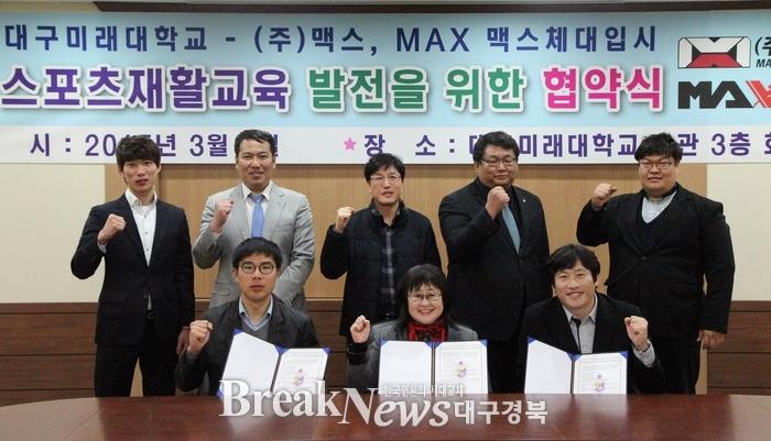 대구미래대학교(총장 이예숙)는 스포츠재활교육의 발전을 위해 (주)맥스(대표 김정하), 맥스체대입시(대표 봉운중)와 지난 9일 오후 2시 대구미래대학교 본관 대회의실에서 협약을 체결했다.
