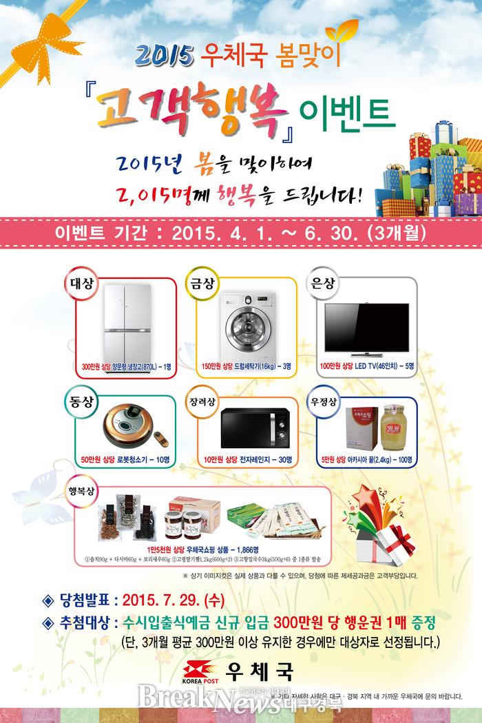 이번 이벤트는 우체국예금 이용고객 중 수시입출식통장에 신규 입금 300만원당 행운권 1매를 증정하며, 3개월 평균잔액 300만원 이상을 유지한 고객이 추첨대상이다. 추첨을 통해 총 2,015명에게 양문형 냉장고(300만원 상당), 드럼세탁기(150만원 상당), LED TV, 로봇청소기, 우체국쇼핑 상품 등 푸짐한 경품을 제공한다. 오는 7월 29일 당첨자 발표예정이며, 명단은 경북지방우정청 홈페이지(www.koreapost.go.kr/kb)에서 확인할 수 있으며 당첨자에게는 문자 메시지가 전달된다. 우체국 봄맞이 고객행복 이벤트에 관한 자세한 사항은 대구․경북관내 우체국이나 경북지방우정청 홈페이지 (www.koreapost.kr/kb)에서 확인할 수 있다.