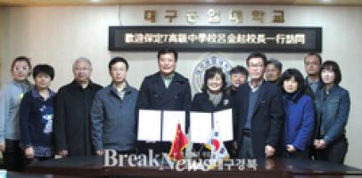 대구공업대학교(총장 이별나)와 중국 하북성 보딩 제7고급고등학교 교장(여금기) 및 학교관계자 일행이 지난 21일 우리대학 본관 세미나실에서 국제교류 자매결연을 통해 교육 정보 교유 및 연계교육 프로그램들의 교류협력 활성화 방안에 대하여 의견을 교환하고 미용예술디자인분야와 자동차 분야에 3+2 연계교육 MOU를 체결했다.