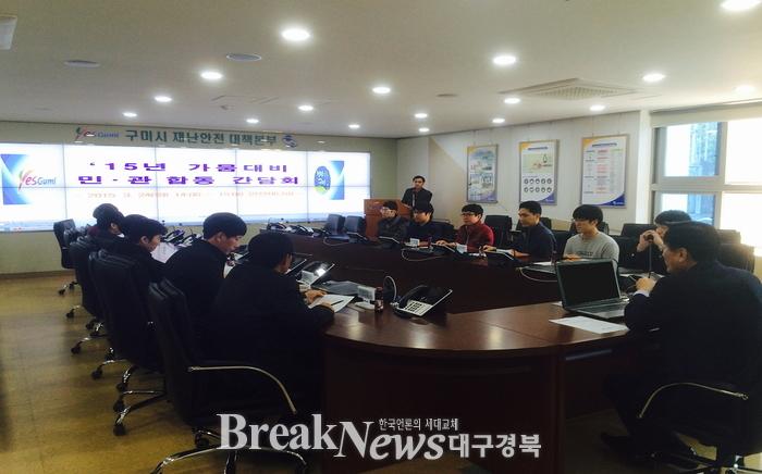 구미시(시장 남유진)에서는 지난 24일 오후2시 재난안전상황실에서2015년 가뭄대비 민․관 합동 간담회를 개최해 기후변화에 따른 지역별 강수부족으로 인한 가뭄 발생 빈도가 증가함에 따른 가뭄재해지역 발생에 대해 관계 부서 및 민간단체, 유관기관 등 8개 부서·단체가 가뭄 정보 공유로 한 발 앞선 재난 대응 태세를 확립했다.