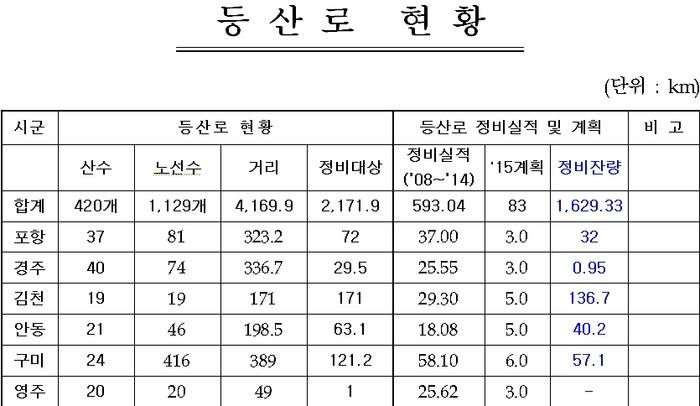 경상북도가 올해 도시근교에 소재한 생활권 등산로 83km를 정비한다. 훼손된 백두대간지역 등산로와 도심주변 생활권 등산로가 주 대상으로, 53억원의 예산이 투입된다. 2010년도 한국갤럽 조사에 따르면 우리나라 사람들은 주 1회 산을 찾는다고 대답한 사람이 15%나 됐다. 월 1회는 26%, 분기1회는 12%,연간 1회는 28%나 될 정도로 19세 이상 성인 5명중 4명이 연 1회 이상 등산할 정도로 대중적인 야외 휴양활동으로 자리 잡고 있다.이를 수치상으로 환산하면 매년 4억 6백만명이 등산에 참여하고 있는 셈.