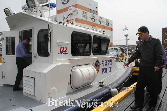 박찬현 동해해양경비안전본부장이 3일 오전 포항해경안전서 죽변안전센터를 방문, 익수자 발생을 가정한 인명구조 훈련을 참관하고 지난 2일 레저활동중 전복된 익수자 2명을 신속하게 구조한 ‘송윤철 경장’에게 표창을 수여했다.