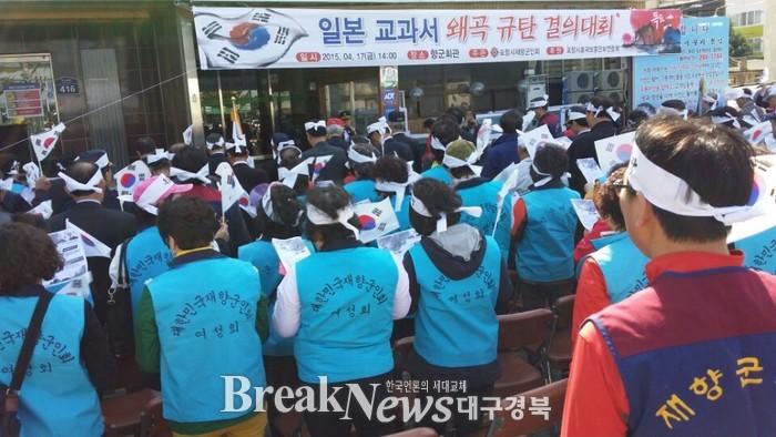 포항시 재향군인회(회장 진규철)에서는 지난 17일 재향군인회관에서 500여명의 회원이 참석한 가운데 일본 교과서 왜곡을 통해 각종 도발행위를 계획하고 있는 일본에 대해 우리의 결연한 독도수호 의지를 천명하기 위한 규탄 결의대회를 가졌다.