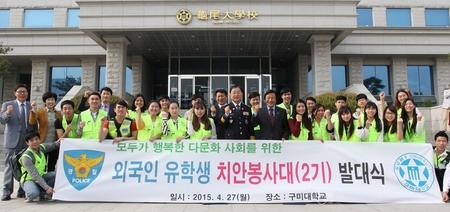 구미대학교(총장 정창주)는 구미경찰서(서장 이준식)와 지난 27일 본관 3층 회의실에서 ‘외국인 유학생 치안봉사대(2기) 발대식’을 가졌다고 밝혔다.