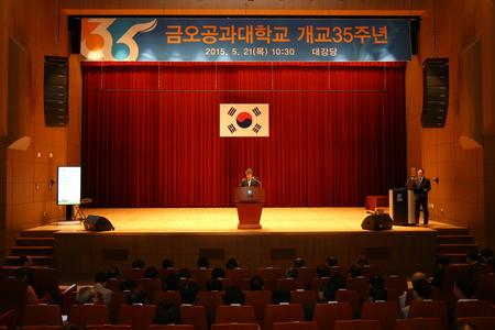 1부 기념식에는 대통령 표창에 이어 교육부장관 표창, 학술상 및 공로상 수여가 있었으며, 개교 35주년을 맞이해 선정한 ‘자랑스러운 금오인상’수여식이 함께 이뤄졌다. 특히 박정희 전 대통령의 의전차량과 교훈석 기증식이 이루어져 개교 35주년의 의미를 더했다. 2부에서는 금오공대 총동창회, 최고경영자과정 총동창회, 석․박사원우회 등 뜻있는 동문들이 힘을 모아 모교에 기증한 ‘교훈석 제막식’이 거행됐다.